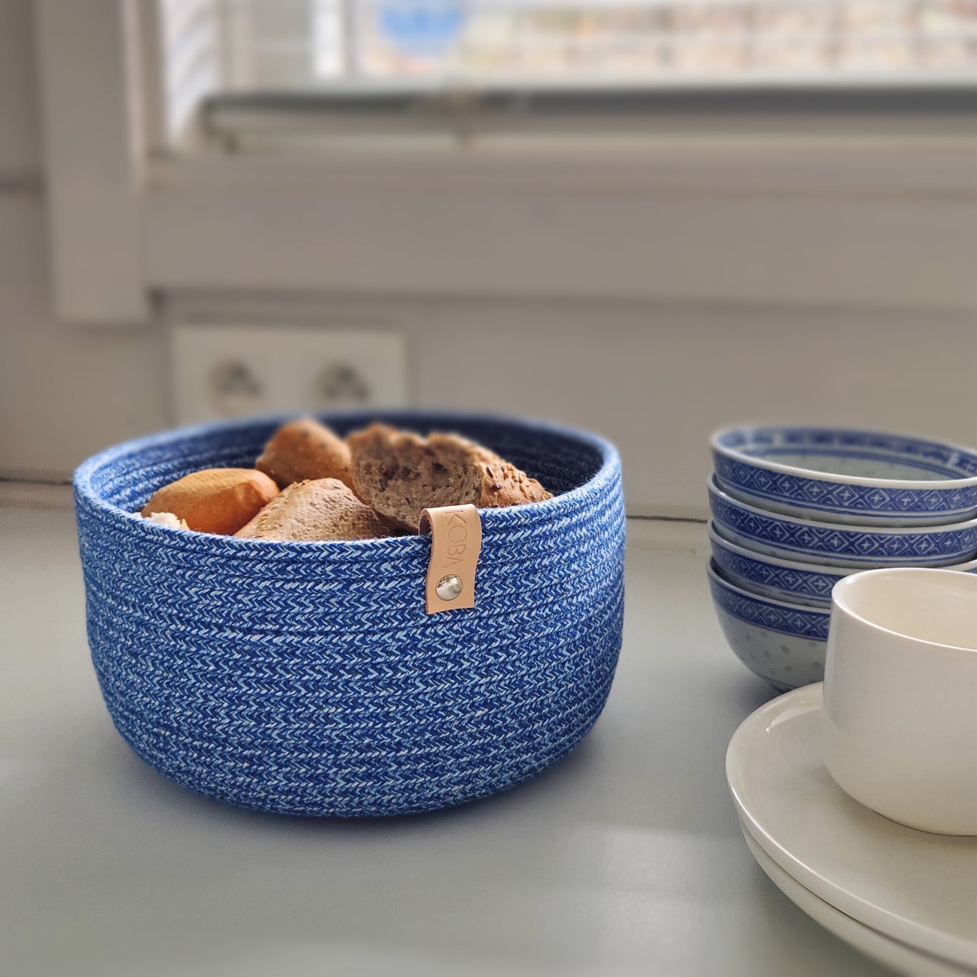 Die Schalen werden ausschließlich aus hochwertiger, in Belgien produzierter, recycelter Baumwollkordel hergestellt. Ein einzelnes langes Stück wird verwendet, um jede Schüssel mit einem einfachen Zickzackstich zu erstellen und zu formen. Eine clevere Farbauswahl bringt viele unverwechselbare Designs hervor, und als kleinen zusätzlichen Twist ist das Ende der Kordel immer mit einem schönen Lederband versehen.