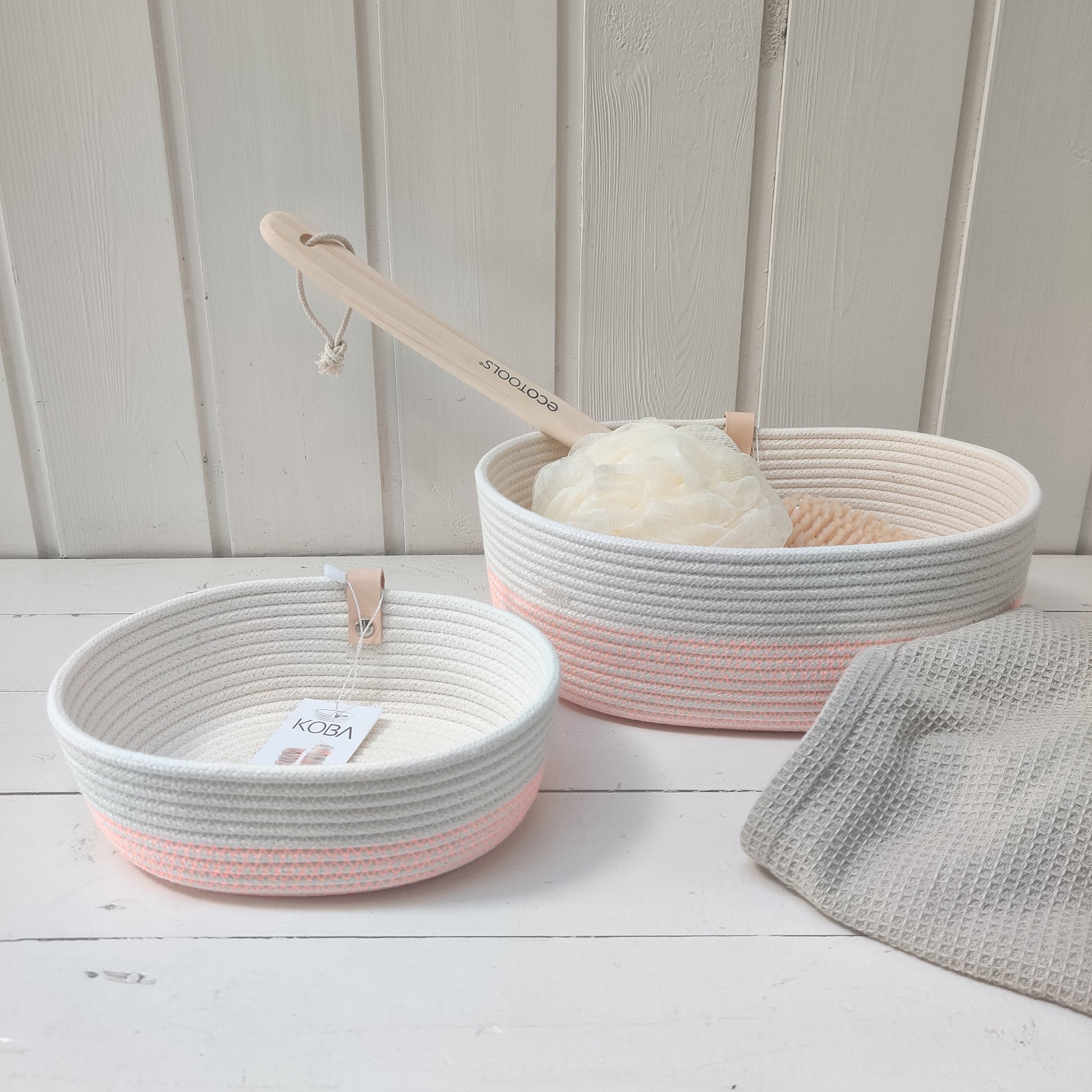 Die Körbe von Soft Stitch können in der Waschmaschine gewaschen werden, da sie keine Lederteile oder Metallnieten enthalten, und das Seil ist gestrickt statt geflochten, was es weicher und flexibler macht.