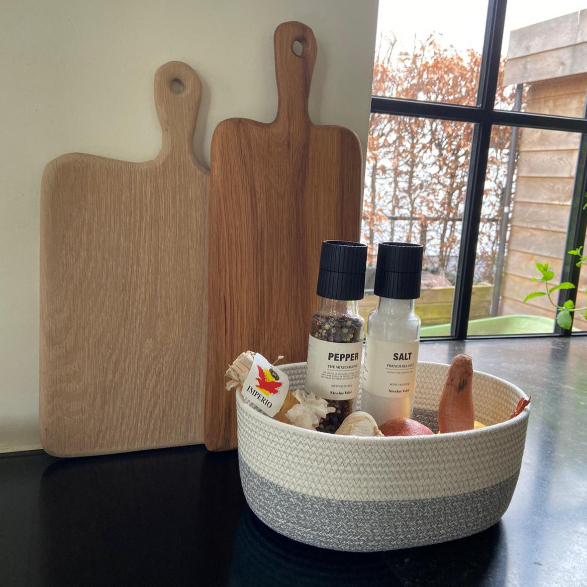 Sie werden ausschließlich aus hochwertigem, in Belgien produziertem, recyceltem Baumwollkord hergestellt. Ein einzelnes langes Stück wird verwendet, um jede Schüssel mit einem einfachen Zickzackstich zu erstellen und zu formen. Eine kleine Extradrehung, das Ende der Kordel ist immer mit einem schönen Lederband versehen.