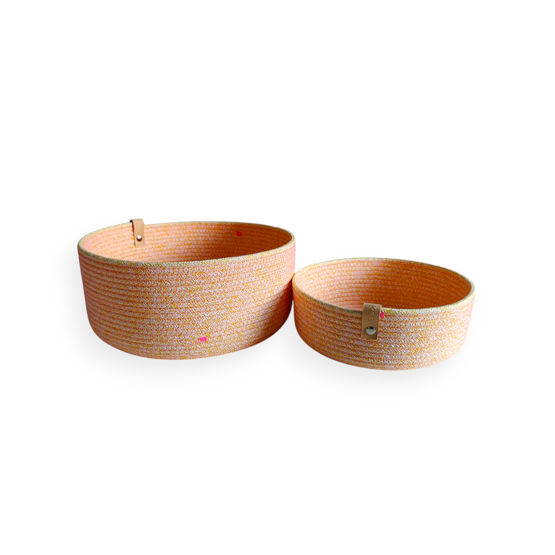 Die Schalen werden ausschließlich aus hochwertiger, in Belgien produzierter, recycelter Baumwollkordel hergestellt. Ein einzelnes langes Stück wird verwendet, um jede Schüssel mit einem einfachen Zickzackstich zu erstellen und zu formen. Eine clevere Farbauswahl bringt viele unverwechselbare Designs hervor, und als kleinen zusätzlichen Twist ist das Ende der Kordel immer mit einem schönen Lederband versehen.