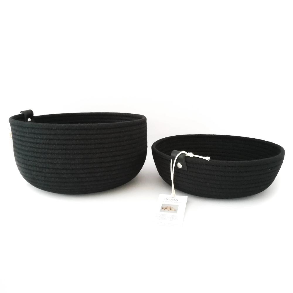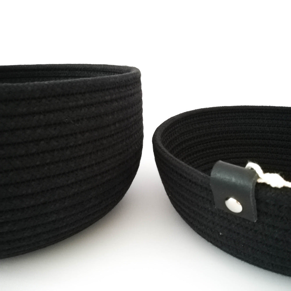 Les bols sont fabriqués exclusivement en cordon de coton recyclé de haute qualité, produit en Belgique. Une seule longue pièce est utilisée pour créer et façonner chaque bol, en utilisant un simple point zigzag. Des choix de couleurs astucieux apporteront de nombreux designs distinctifs, et comme petite touche supplémentaire, l'extrémité du cordon est toujours finie avec une belle lanière en cuir.