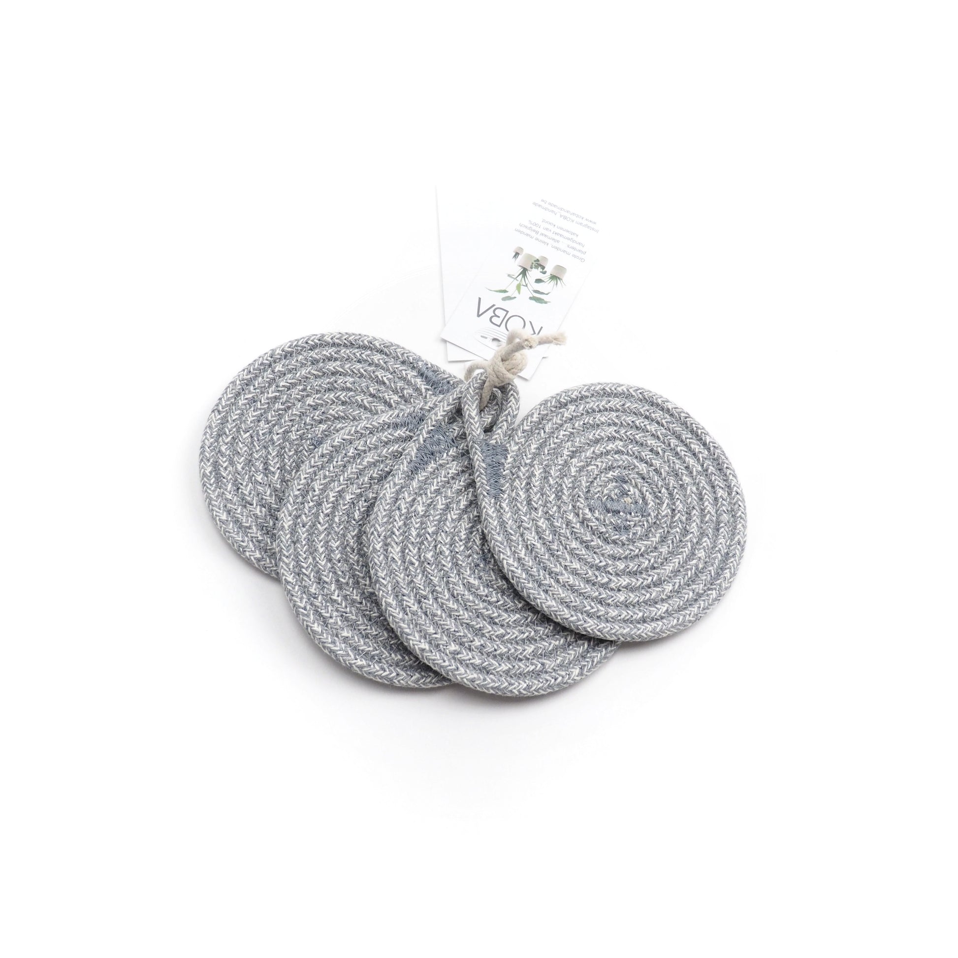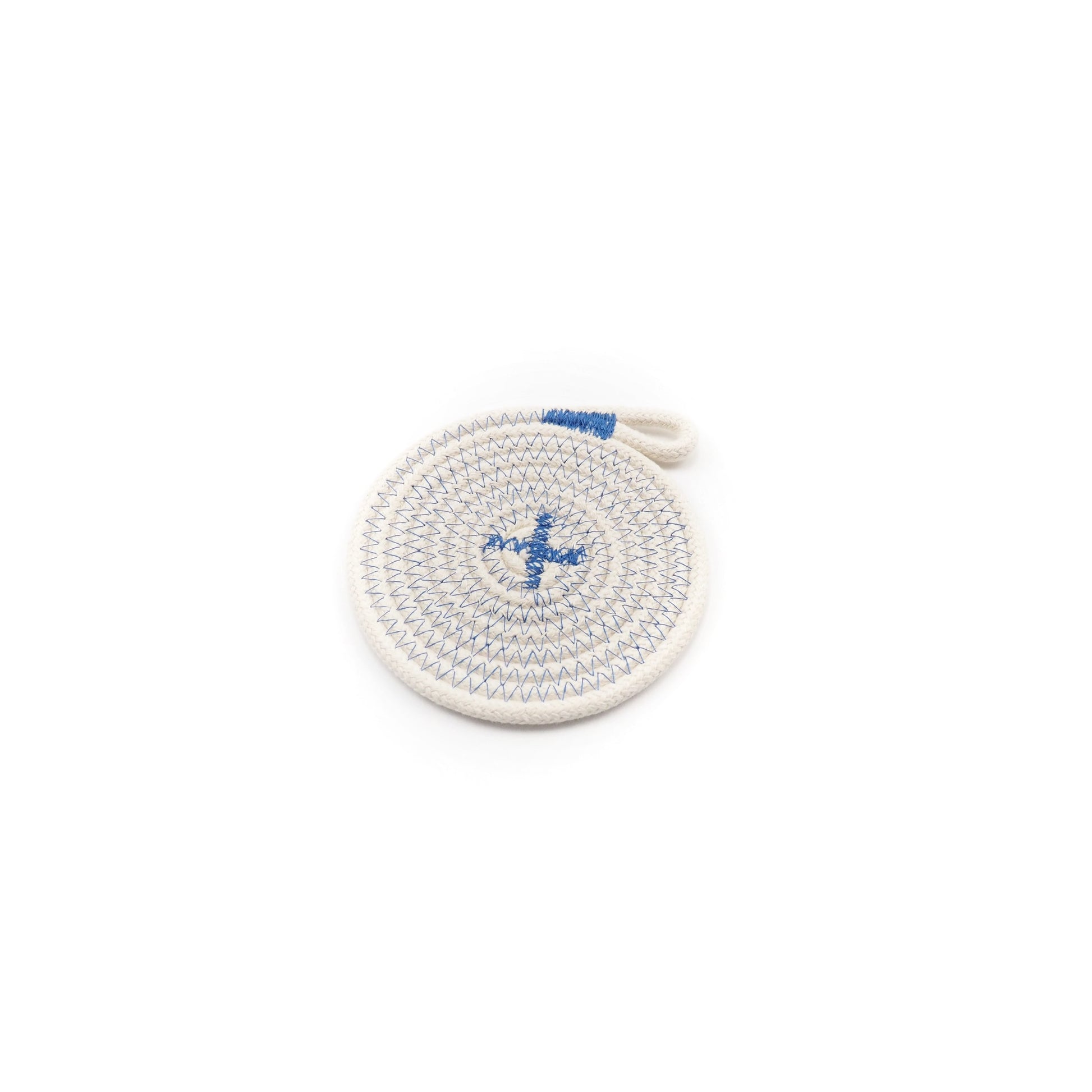 Les sous-verres sont fabriqués exclusivement en cordon de coton de haute qualité, produit en Belgique. Une seule longue pièce est utilisée pour créer et façonner chaque bol, en utilisant un simple point zigzag.