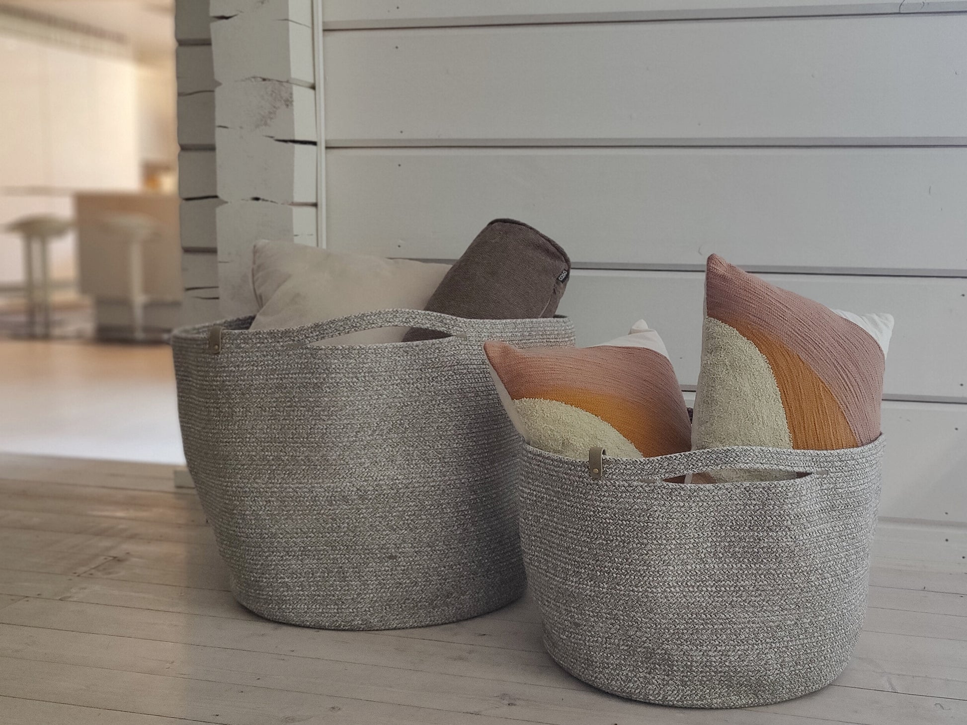 Soft Stitch baskets can be machine washed because they don’t contain leather parts or metal rivets, and the rope is knitted instead of braided, which makes it softer and more flexible.
