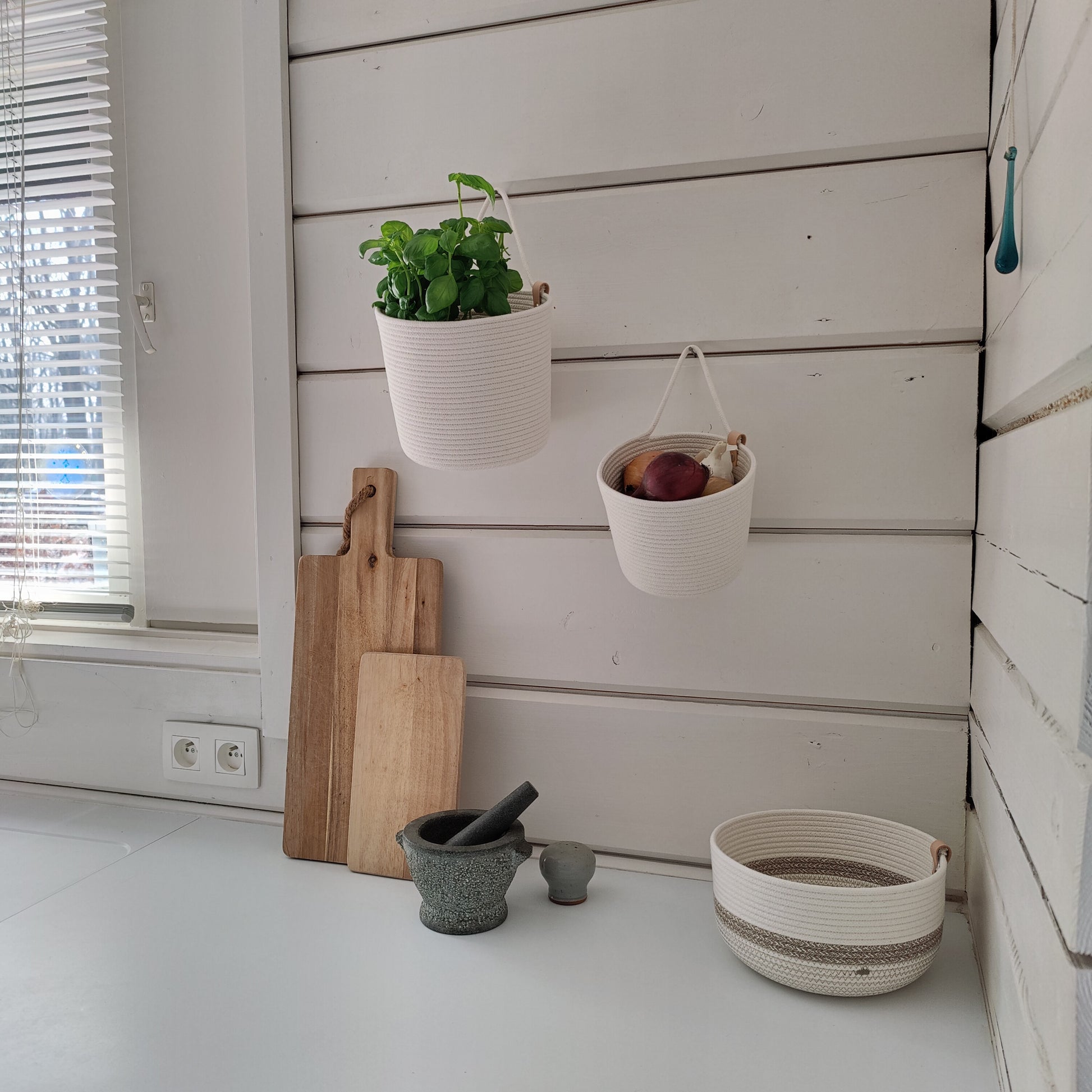 Joli panier fonctionnel, utilisez-le pour contenir divers articles tels que des oignons, des herbes, des fruits, du maquillage, de la crème solaire... . Les paniers suspendus peuvent décorer le salon, la cuisine, la salle de bain et la chambre.